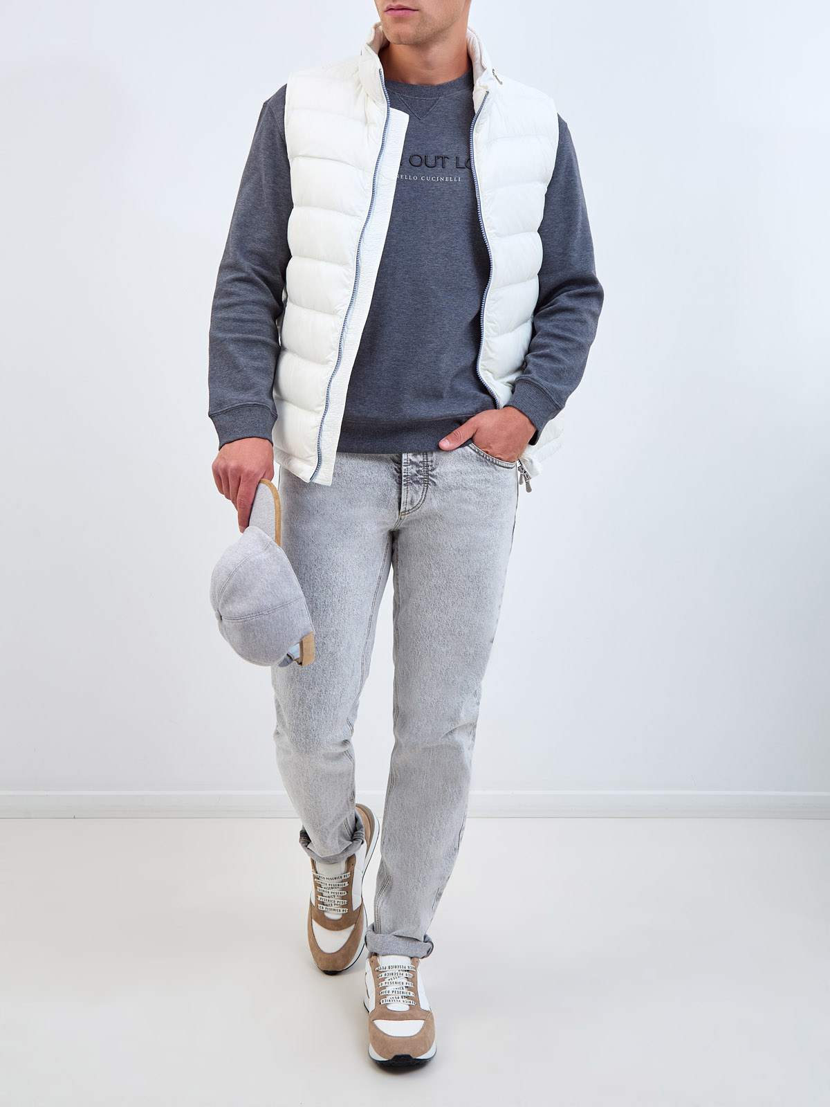 Мужской свитшот из коллекции Travelwear от Brunello Cucinelli. Модель выполнена из мягкого хлопкового футера — дышащей ткани с гладкой внешней и фактурной внутренней поверхностью. Эластичные волокна в составе облегчают уход и препятствуют образованию складок. Изделие дополнено гармоничной вышивкой Dream Out Loud на передней планке. Детали: длинные рукава, круглый вырез горловины, простроченная отделка кромок. Сделано в Италии.