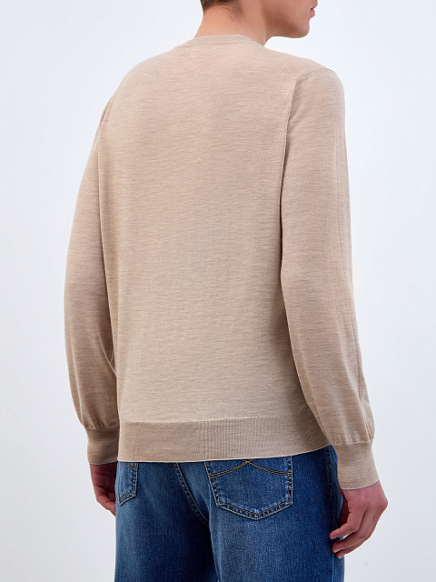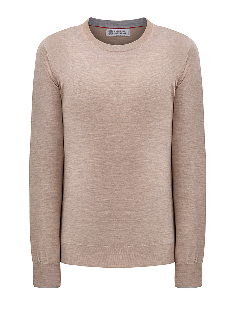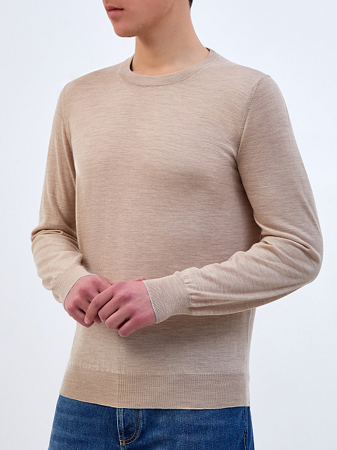 Лаконичный мужской джемпер от Brunello Cucinelli выполнен в универсальной бежевой гамме. Полностью натуральный материал на основе ценных волокон шерсти и кашемира обладает свойством поддерживать температуру тела на оптимальном уровне. Эластичные элементы английской вязки обеспечивают посадку точно по фигуре, контрастная окантовка манжет вносит в образ неформальный штрих. Сделано в Италии.