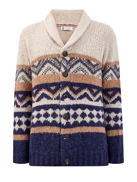 Теплый мужской кардиган в этническом стиле от Brunello Cucinelli. Для создания модели была выбрана плотная фактурная пряжа из шерсти альпаки с нитью кашемира. Жаккардовая техника вязки образует принт в стиле народов Южной Америки. Свободный крой с шалевым воротом и застежкой на пуговицы из рога обеспечивает максимальный комфорт. Детали: базовое цветовое исполнение, эластичная отделка кромок. Сделано в Италии.