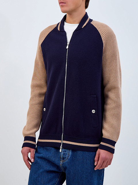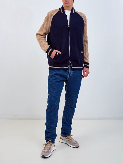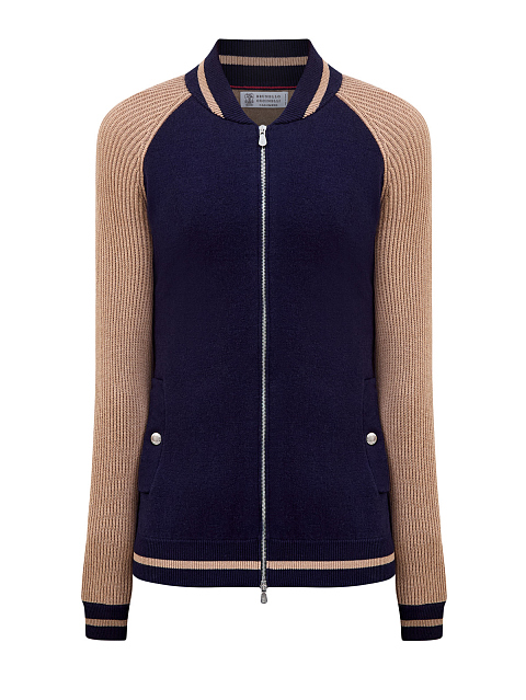 Комбинированный кардиган-бомбер от Brunello Cucinelli сочетает плотный флис и контрастные рукава в технике английской вязки. Материал на основе премиальной шерсти, шелка и кашемира обеспечивает максимальный комфорт в прохладную погоду, невысокий процент синтетических волокон в составе облегчает уход за изделием. Детали: застежка на молнию с двойным пуллером, прорезные карманы на кнопках. Сделано в Италии.