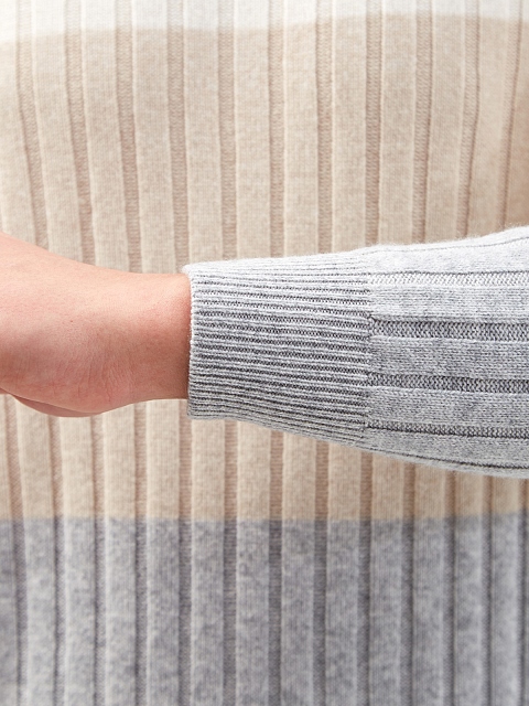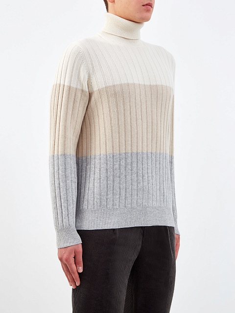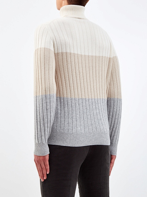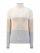 Теплый мужской свитер в стиле colorblock от Brunello Cucinelli. Модель из фактурной пряжи на основе ценных волокон шерсти, кашемира и шелка идеально подходит для создания повседневных аутфитов. Сочетание белых, бежевых и серых тонов подчеркивает расслабленное настроение изделия. Детали: высокий ворот, отделка кромок в технике эластичной английской резинки. Сделано в Италии.