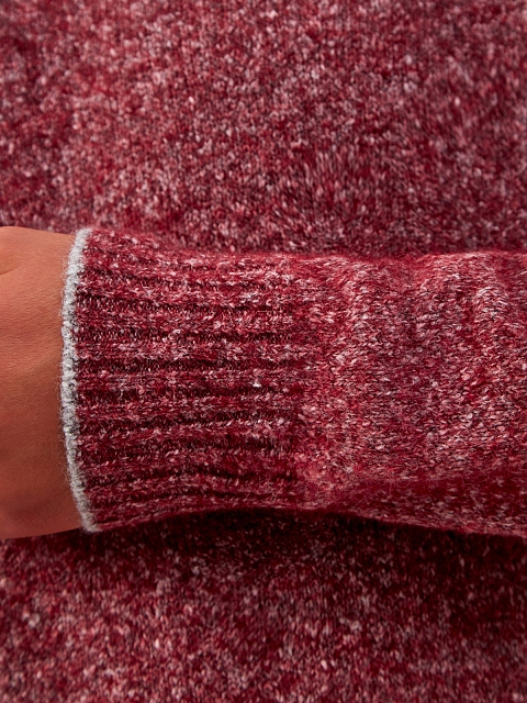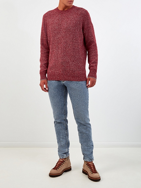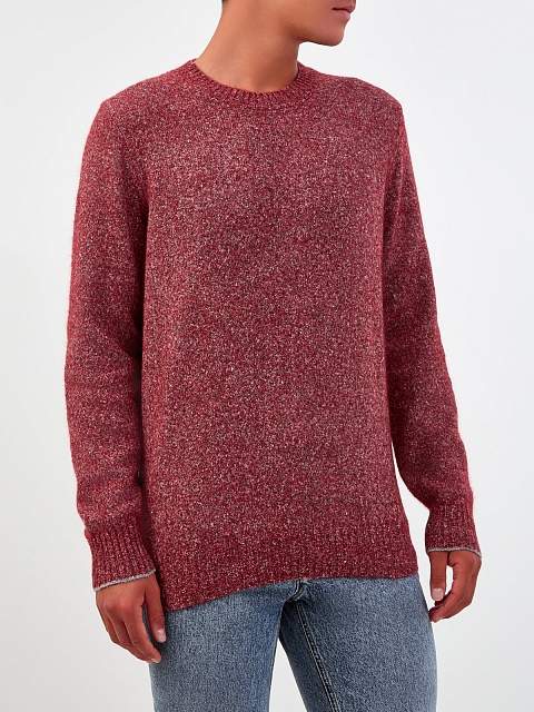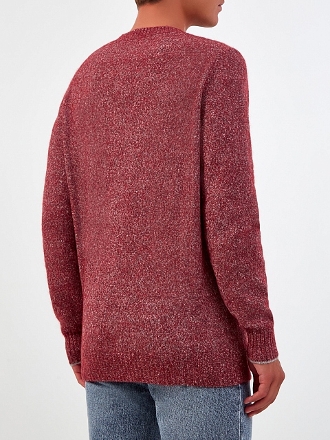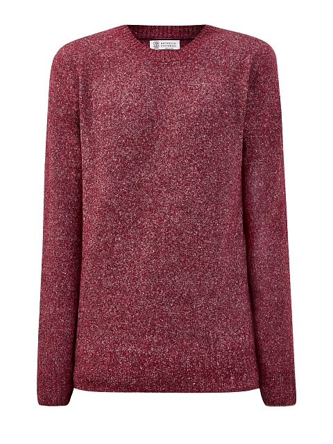 Джемпер ручной работы от Brunello Cucinelli создан в бордовой гамме из альпаки, хлопка и шерсти. За счет твидовой структуры пряжи материал дополняется размытым эффектом цвета, который объединяется с воздушным по своей природе волокном альпаки. Ворот в технике английской вязки и уплотненная нижняя кромка формируют свободный силуэт, эластичные манжеты дополнены контрастным кантом. Сделано в Италии.