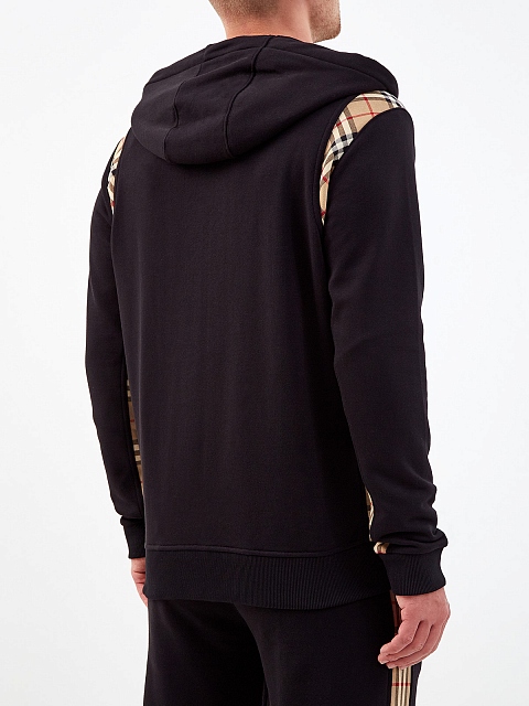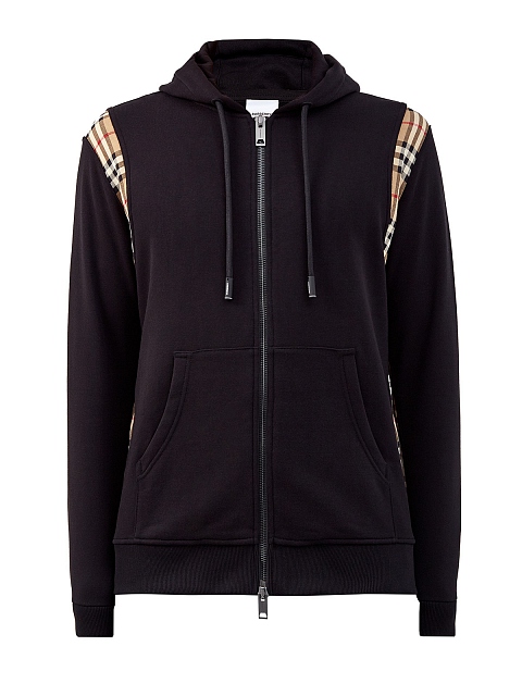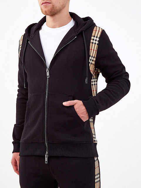 Мужская толстовка от Burberry выполнена из плотного хлопкового футера — эластичная ткань с мягкой внутренней поверхностью идеально подходит для путешествий и активного отдыха. Модель в базовом черном цвете дополнена глубоким капюшоном на регулируемой кулиске. Фирменный штрих — архивный принт в клетку Vintage Check на боковых планках. Детали: эластичная отделка рукавов и нижнего края, накладные карманы, застежка-молния.