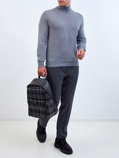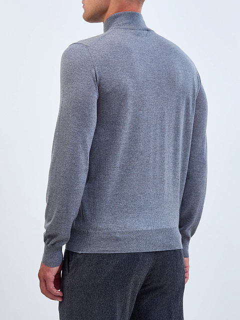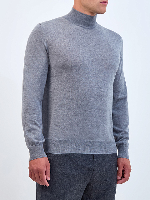 Мужская водолазка от Canali полностью выполнена из мягкой шерстяной пряжи в меланжево-серой гамме. Техника чулочной вязки с плотным расположением петель и ценные свойства натурального материала делают модель теплой, и при этом легкой. Изделие кроя по фигуре дополнено эластичными манжетами и нижней кромкой в английскую резинку. Высокий ворот надежно защищает от ветра. Сделано в Италии.