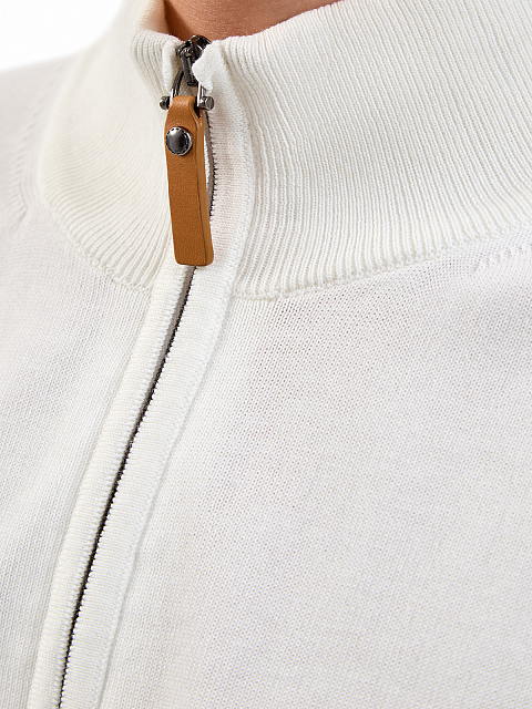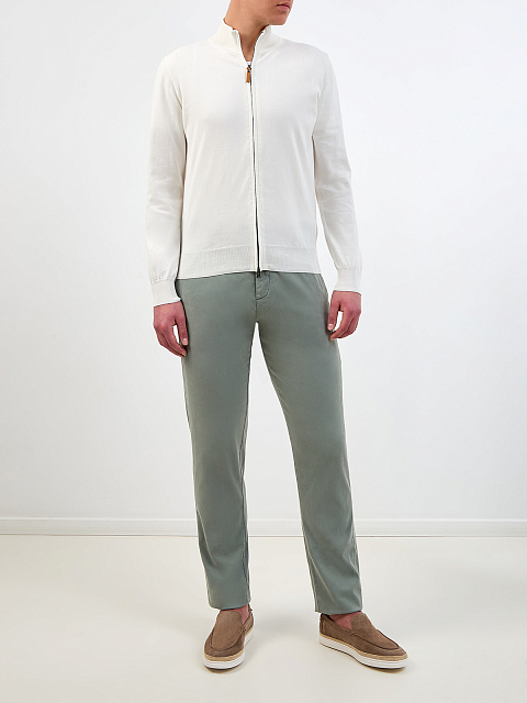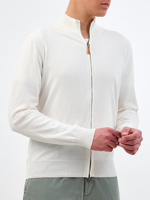 Мужской кардиган от Canali выполнен из хлопковой пряжи в молочно-белом оттенке. Слегка облегающий крой дополнен эластичными кромками для комфортной посадки, а также высоким воротом для защиты от ветра. Однотонное исполнение и минималистичный дизайн делают модель идеальной для создания образов в стиле smart casual. Детали: застежка-молния с кожаным пуллером, длинные рукава. Сделано в Италии.