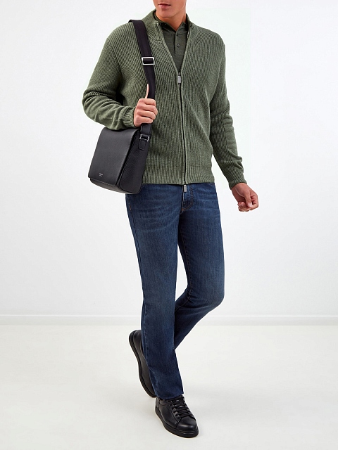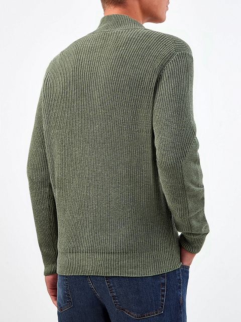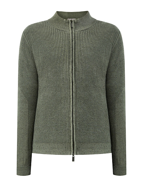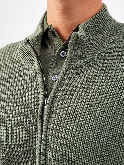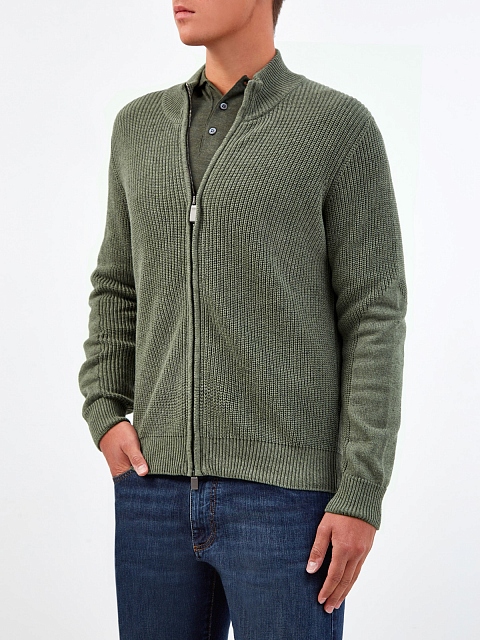 Стильный мужской кардиган от Canali выполнен из натуральной хлопковой пряжи с нитью кашемира для дополнительной мягкости. Изделие в приглушенном зеленом оттенке с воротом-стойкой дополнено практичной застежкой-молнией. Детали: эластичные манжеты в рубчик, нижняя кромка в английскую резинку. Сделано в Италии.