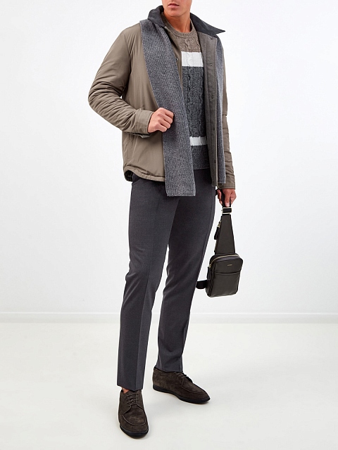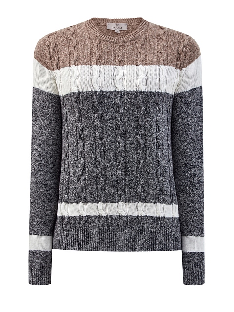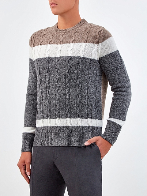 Теплый джемпер из шерстяной пряжи от Canali выполнен в стиле colorblock в бежевых, серых и белых тонах. Отделка кромок в технике английской вязки создает комфортный, и в то же время прилегающий силуэт. Орнамент «косы» на передней планке подчеркивает объемную фактуру и придает изделию расслабленный штрих. Сделано в Италии.