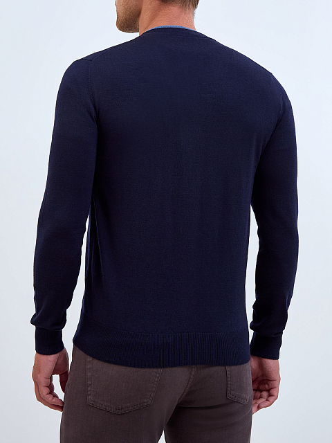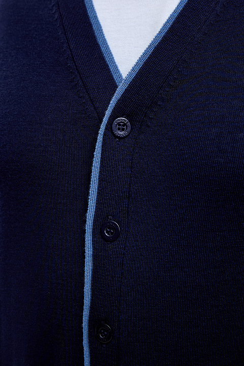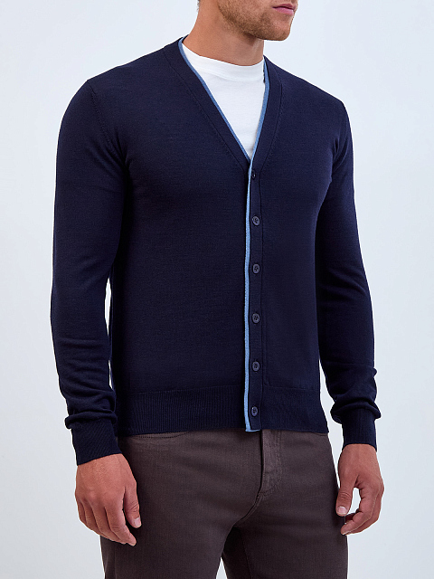 Лаконичный мужской кардиган из шерстяной пряжи от Canali создан в оттенке ночного неба. Ценные свойства натурального материала делают вес модели оптимально легким, а поверхность — гладкой и мягкой. Изделие в расслабленном стиле с V-образным вырезом и застежкой на брендированные пуговицы дополнено контрастной окантовкой. Эластичные кромки обеспечивают точную посадку по фигуре. Сделано в Италии.