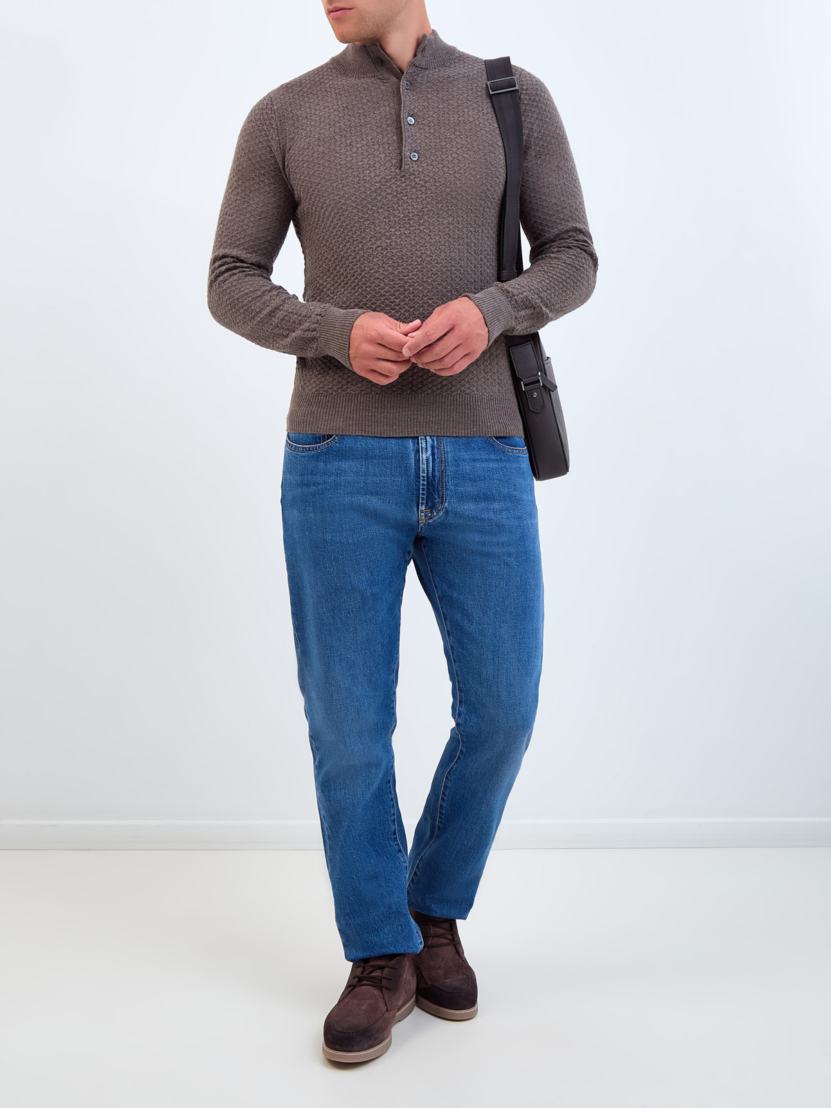 Мужской джемпер от Canali полностью выполнен из тонкой, но теплой шерстяной пряжи. Однотонное исполнение и минималистичный дизайн делают модель идеальной для составления повседневных образов в стиле sprezzatura. Расслабленный штрих вносит фактурный узор в тон и застежка на пуговицы из перламутра. Детали: эластичные кромки в английскую резинку, слегка облегающий крой. Сделано в Италии.
