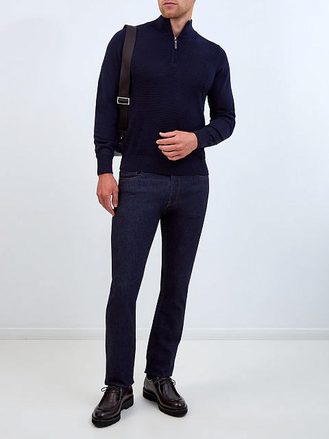 Мужской джемпер от Canali полностью выполнен из тонкой, но теплой шерстяной пряжи. Однотонное исполнение и минималистичный дизайн делают модель идеальной для составления повседневных образов в стиле sprezzatura. Расслабленный штрих вносит фактурный узор в тон и застежка на молнию с кожаным пуллером. Детали: эластичные кромки в английскую резинку, слегка облегающий крой. Сделано в Италии.