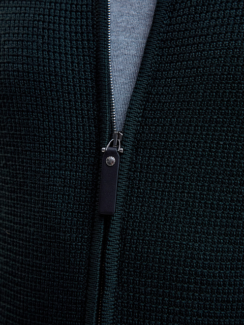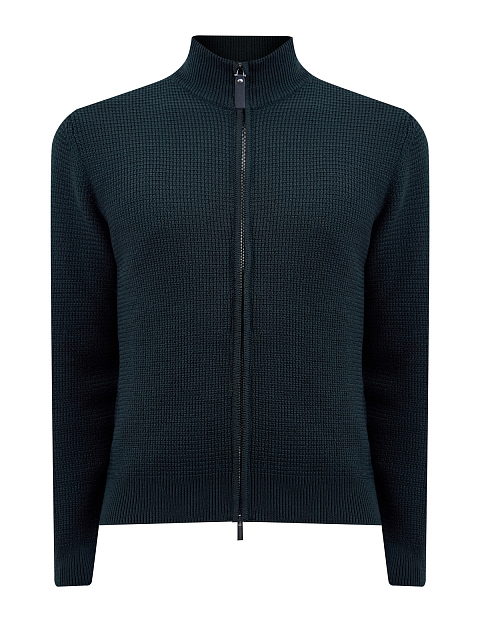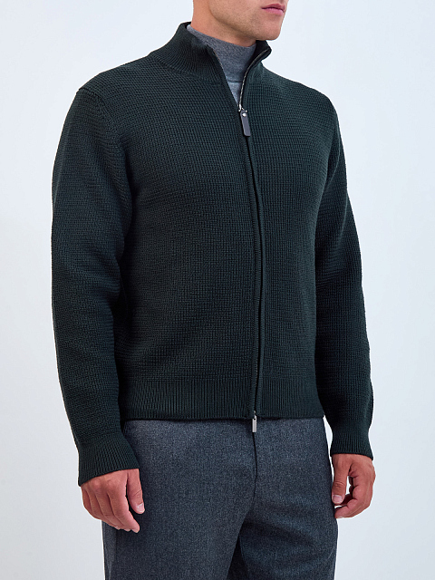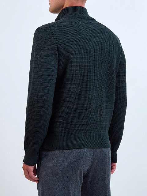 Джемпер из шерстяной пряжи в темно-зеленом оттенке от Canali. Техника плотной фактурной вязки раскрывает свойства натурального материала. Облегающий крой дополнен эластичными манжетами и нижним краем для максимально комфортной посадки. Высокий ворот-гольф и застежка на молнию с двойным пуллером дополнительно защищают от ветра. Сделано в Италии.