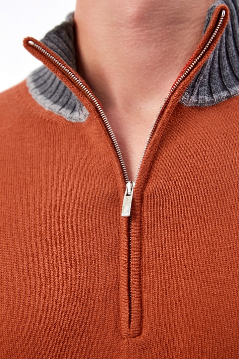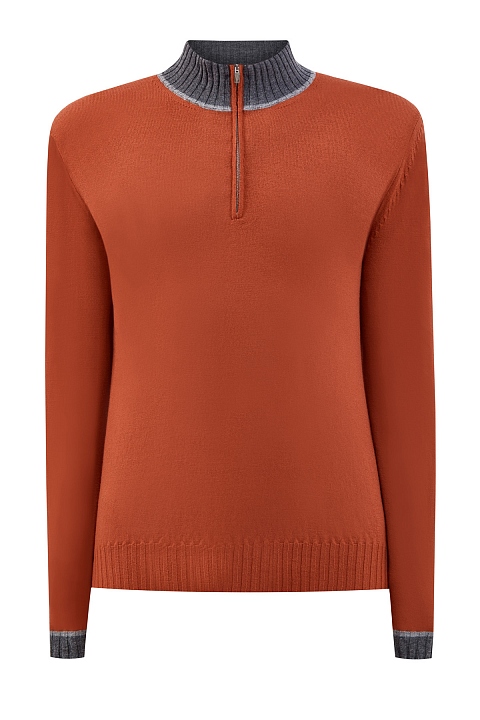 Яркий мужской джемпер от Cortigiani создан из шерстяной пряжи с добавлением нити кашемира — полностью натуральный состав делает модель особенно актуальной в зимний сезон. Однотонная модель цвета «охра» дополнена акцентами в стиле colorblock по кромкам и вязаным принтом на спинке, который вносит в образ нотку неформального шика. Детали: ворот-стойка с застежкой на молнию, эластичная отделка по краям. Сделано в Италии.