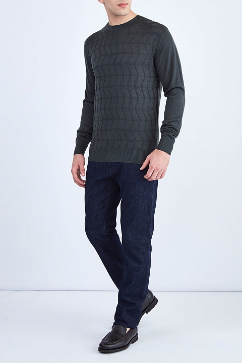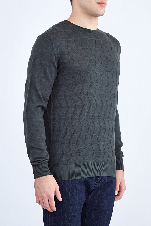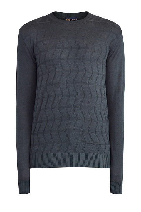 Минималистичный мужской джемпер от Cudgi создан из шерстяной пряжи с добавлением тенсела — материала на основе волокон австралийского эвкалипта, прошедших нано-обработку. Модель богатого серо-зеленого оттенка дополнена фактурным вязаным узором по передней планке. Манжеты и нижняя кромка в рубчик обеспечивают посадку по фигуре.