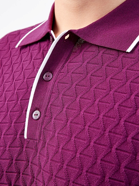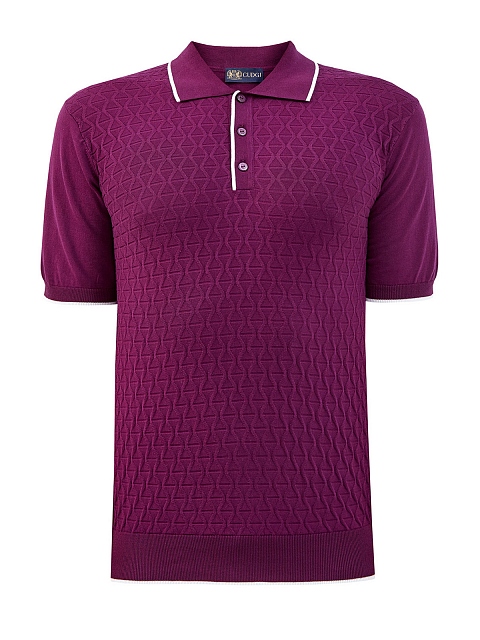 Стильный джемпер-поло от Cudgi создан из хлопковой пряжи в насыщенном пурпурном оттенке. Дышащий материал не стесняет движений и идеально подходит для летнего сезона, фактурный вязаный узор по всей поверхности изделия придает расслабленный штрих повседневному образу. Детали: отложной ворот с контрастной окантовкой, эластичные кромки, застежка на пуговицы.