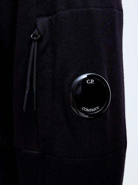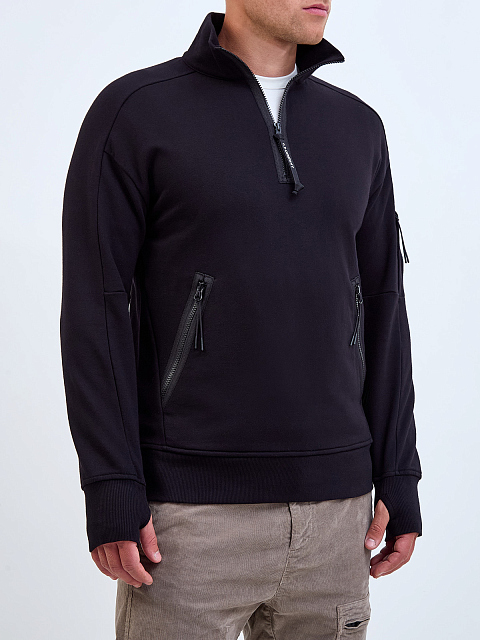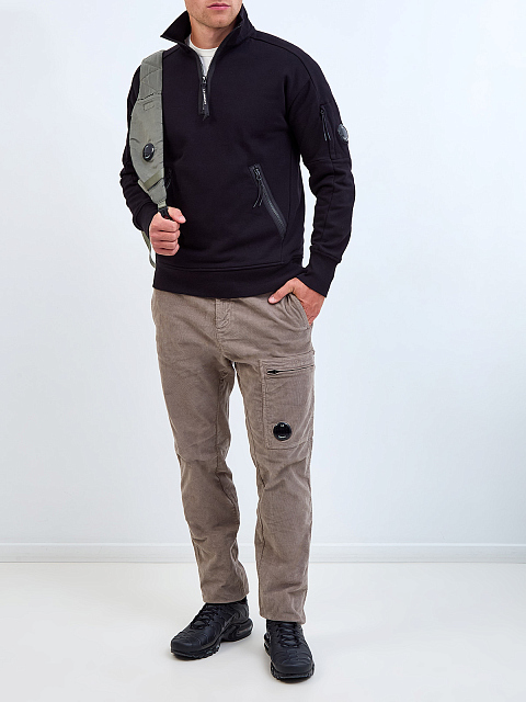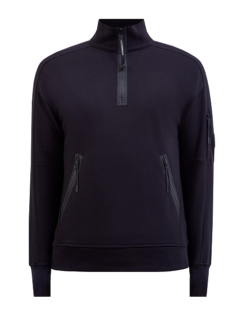 Минималистичная толстовка в спортивном стиле от C.P. Company создана из хлопкового флиса диагонального переплетения. Модель в оттенке ночного неба дополнена эластичными манжетами с митенками, кромками в английскую резинку и фирменной линзой C.P. на рукаве. Детали: высокий ворот с застежкой-молнией, пуллеры с логотипом, карманы на молниях.