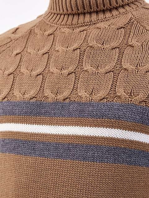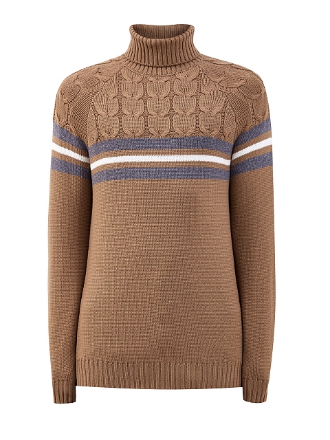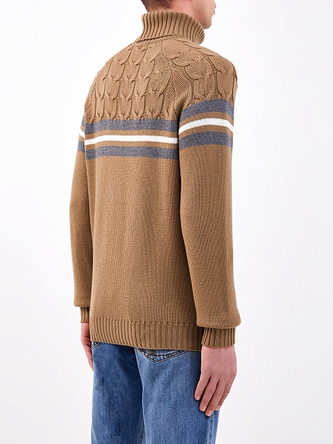 Мужской свитер от Eleventy представлен в лаконичной светло-коричневой гамме. Для создания модели была выбрана мягкая шерстяная пряжа, полностью натуральный состав обеспечивает тепло и комфорт. Изделие дополнено высоким воротом, а также фактурным вязаным орнаментом и контрастным узором в полоску. Детали: облегающий крой, эластичная отделка кромок в английскую резинку. Сделано в Италии.