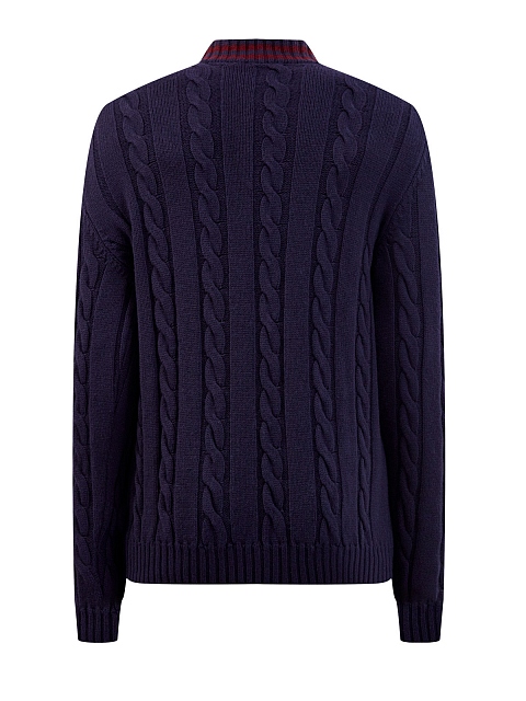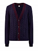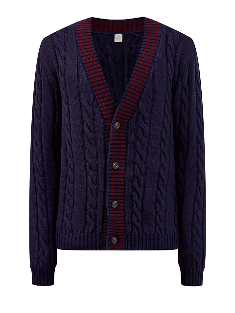 Мужской кардиган в лаконичном синем цвете от Eleventy выполнен из мягкой шерстяной пряжи. Классический вязаный узор «косы» и отделка кромок нитью оттенка бордо вносят неформальный акцент в повседневный образ. Изделие дополнено застежкой на брендированные пуговицы на передней планке. Детали: эластичные манжеты в рубчик, нижний край в английскую резинку, V-образный вырез. Сделано в Италии.