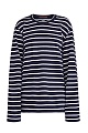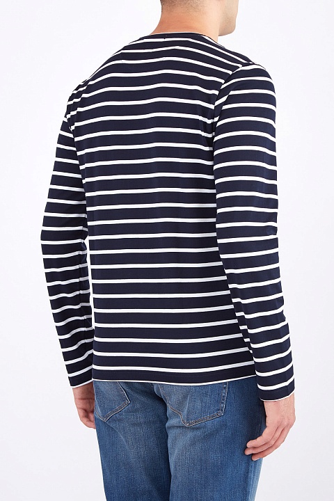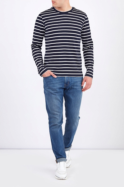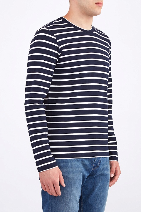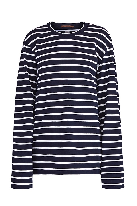 Базовый мужской джемпер oversize-кроя из весенне-летней коллекции Eleventy выполнен из мягкого хлопка с набивным принтом в контрастную полоску в глубоких синих и белых тонах. Модель в расслабленном стиле с круглой проймой горловины с эластичной окантовкой.
