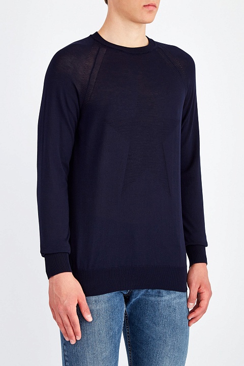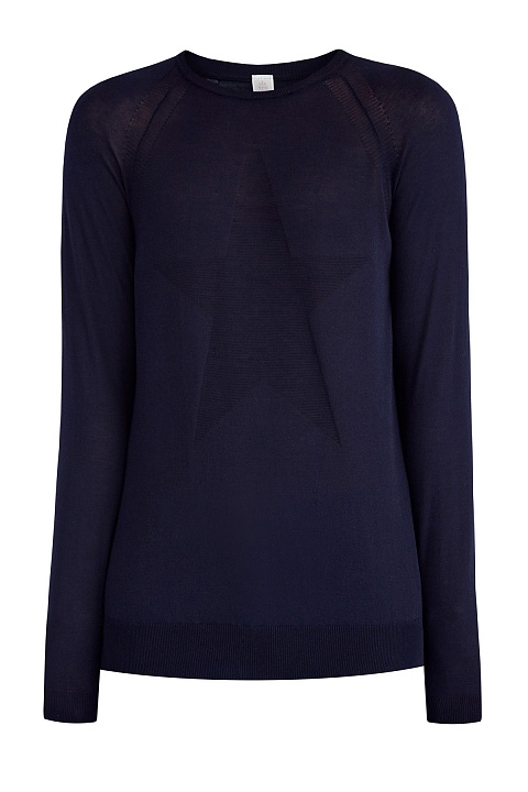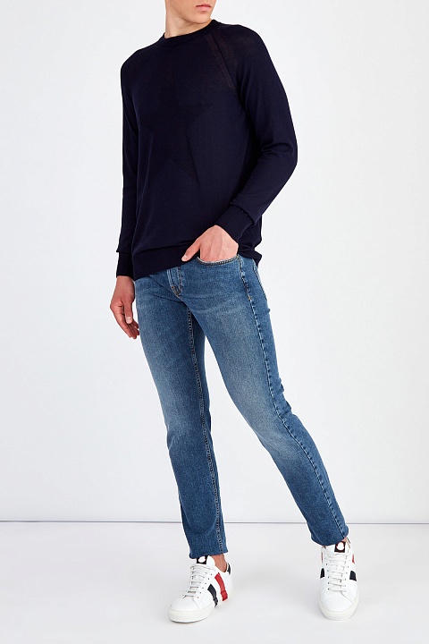 Легкий мужской джемпер от Eleventy выполнен из тонкой хлопковой пряжи в универсальном темно-синем оттенке. Динамику образу придают элементы фактурной вязки, которые подчеркивают линии кроя и формируют макро-изображение звезды на передней планке. Объемный крой в расслабленном стиле подчеркивают манжеты и нижняя кромка в рубчик. Сделано в Италии.
