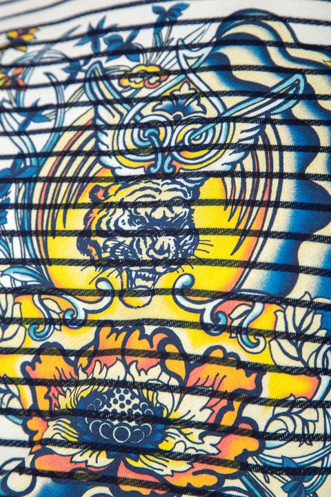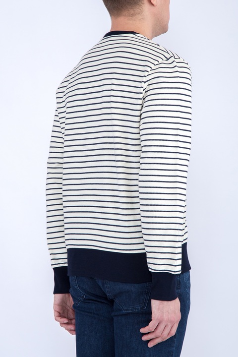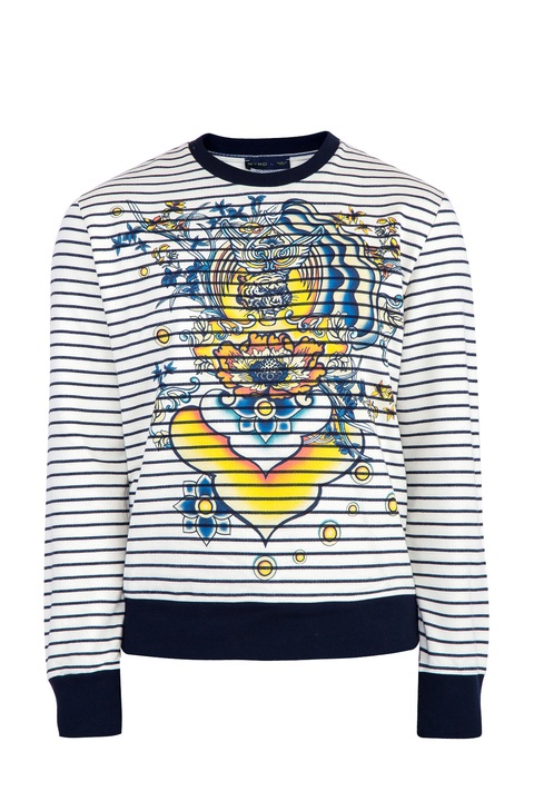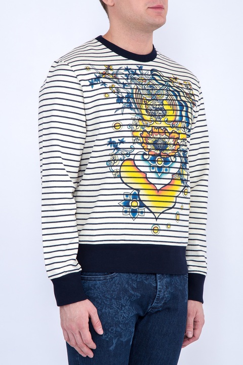 Стильный мужской джемпер Etro свободного кроя, выполненный из мягкого хлопка молочного оттенка. Модель украшена узором в марокканском стиле, расположенным спереди, и горизонтальными полосами по всему полотну. Изделие характеризуется эластичными кромками и манжетами контрастного цвета. Сделано в Италии.