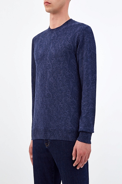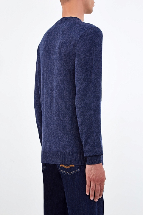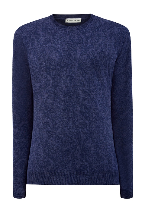 Базовый шерстяной джемпер от Etro. Для создания модели была выбрана тонкая, но теплая шерстяная пряжа — благодаря плотному расположению петель изделие идеально подходит для холодного времени года. Этнический принт подобран специально для каждого элемента кроя. Детали: круглый ворот, эластичная отделка кромок. Сделано в Италии.