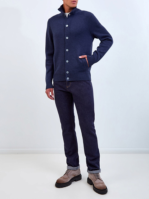 Лаконичный мужской кардиган в синем цвете от Gran Sasso выполнен из теплой шерстяной пряжи. Полностью натуральный состав обеспечивает максимальный комфорт в прохладную погоду и идеально подходит для многослойных образов. Изделие с высоким воротом и кромками английской вязки дополнено застежкой на пуговицы и прорезными карманами.