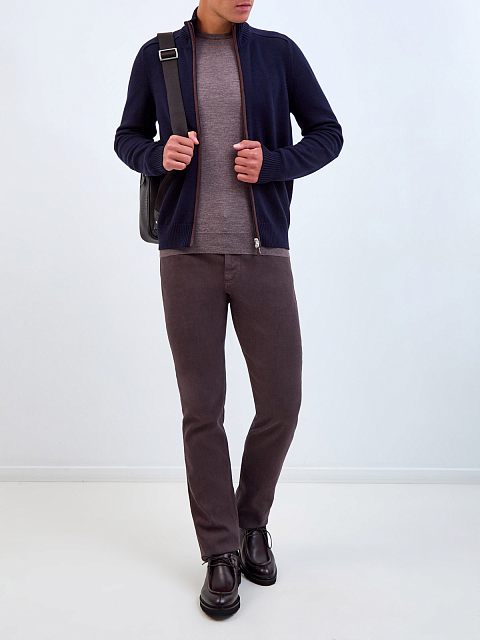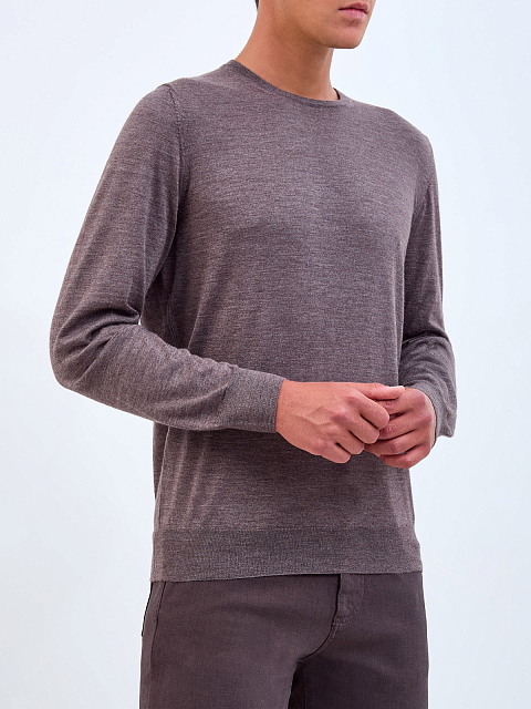 Лаконичный мужской джемпер в стиле casual от Gran Sasso. Модель выполнена из легкой пряжи на основе ценных волокон кашемира и шелка в меланжево-коричневом оттенке, прядение в одно сложение нити обеспечивает оптимальный вес изделия. Детали: длинные рукава, круглый вырез горловины, отделка кромок в английскую резинку.