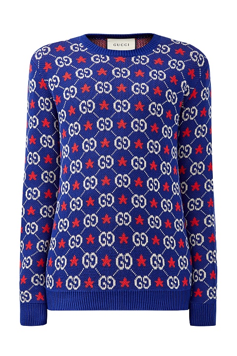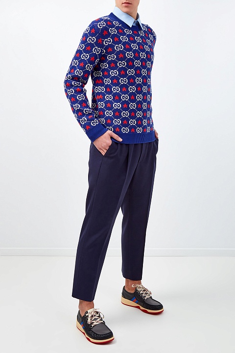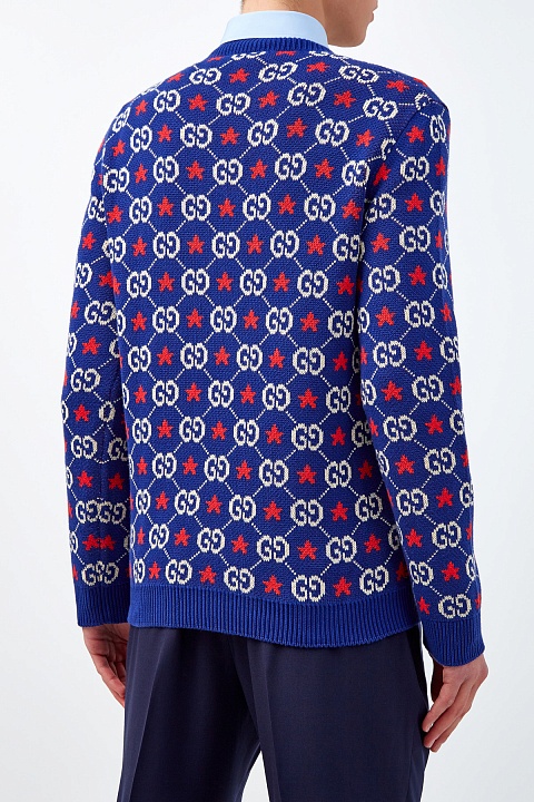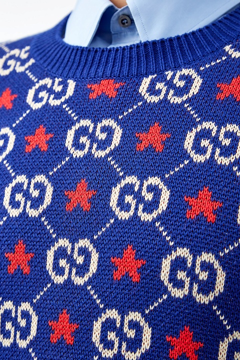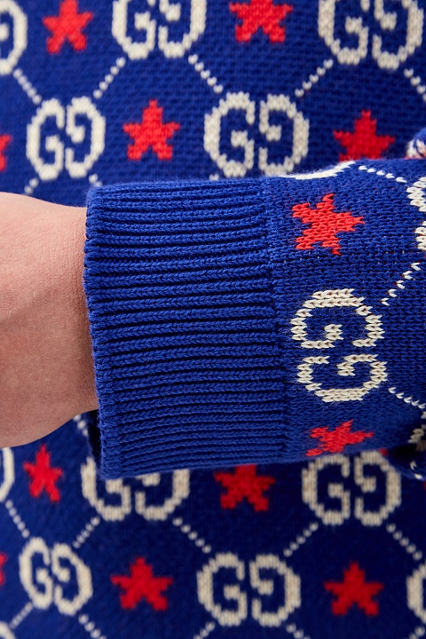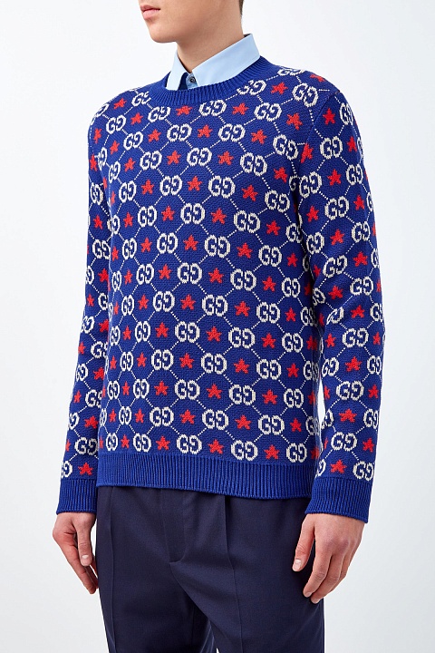 Теплый мужской джемпер от Gucci выполнен из плотной хлопковой пряжи. Культовый ромбический орнамент получает новую интерпретацию благодаря изображениям звезд. Модель свободного кроя не стесняет движений, а эластичная отделка кромок в рубчик обеспечивает посадку по фигуре. Детали: круглый вырез горловины, длинные рукава. Сделано в Италии.
