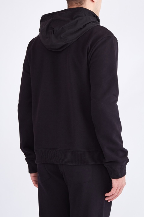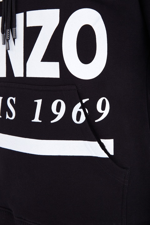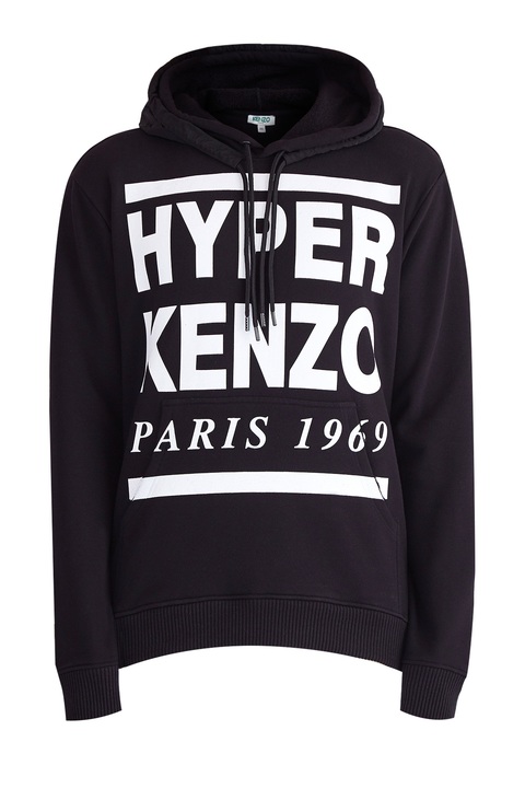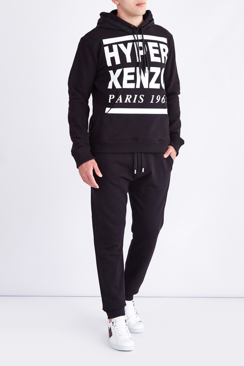 Стильная мужская толстовка Kenzo свободного кроя выполнена из мягкого хлопкового футера черного цвета и дополнена контрастным принтом с символикой бренда на передней панели. Модель характеризуется накладным карманом «Кенгуру» и двойным капюшоном, внешняя часть которого создана из непромокаемого нейлона.