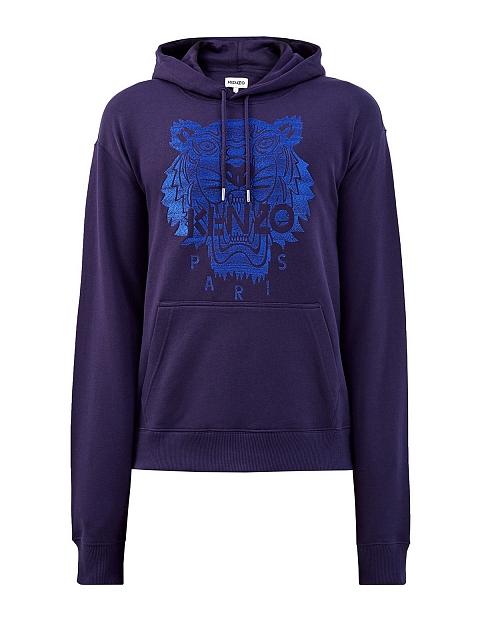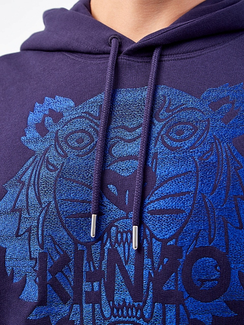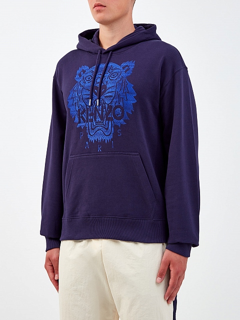 Худи-carryover от Kenzo. Изделие представлено в глубоком синем оттенке и дополнено вышитым макро-логотипом бренда с изображением головы тигра. Хлопковый футер не стесняет движений, а свободный крой с эластичной отделкой по краям обеспечивает посадку точно по фигуре. Детали: капюшон на кулиске, один накладной карман.