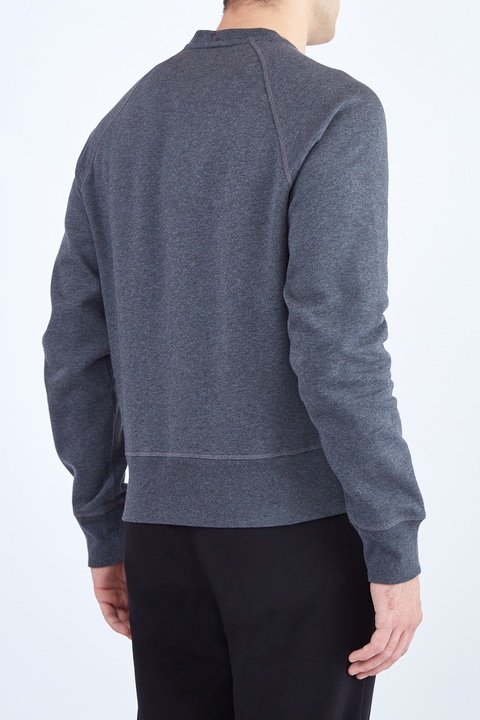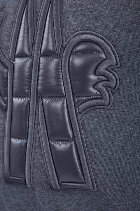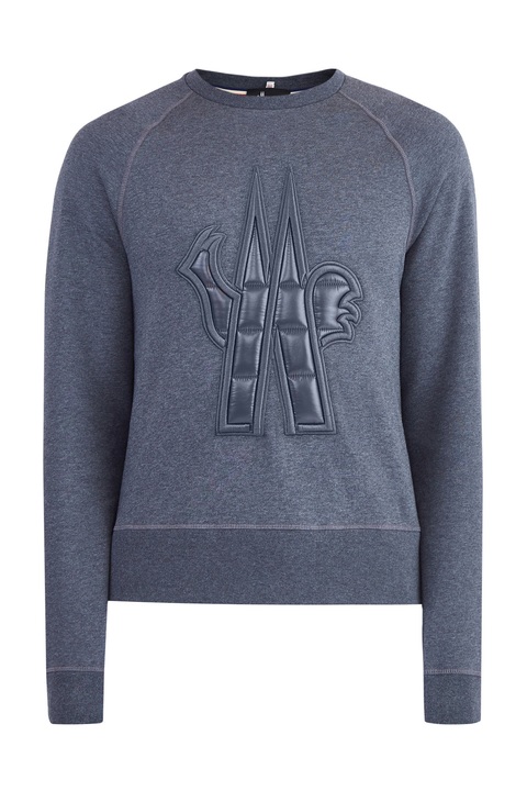 Мужской свитшот «Après Ski» из линии Grenoble от Moncler выполнен из хлопкового футера меланжевого серого тона с внутренним начесом. Передняя планка декорирована макро-логотипом из глянцевого нейлона с внутренней набивкой для создания объемного эффекта и контрастной обметкой краев. Детали: рукава-реглан, круглый вырез горловины, эластичные кромки.