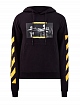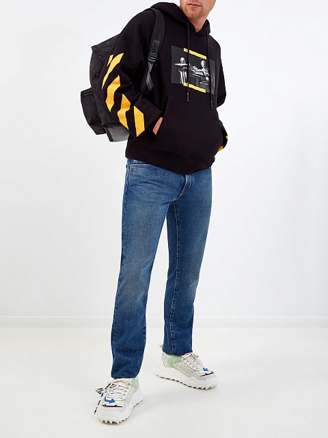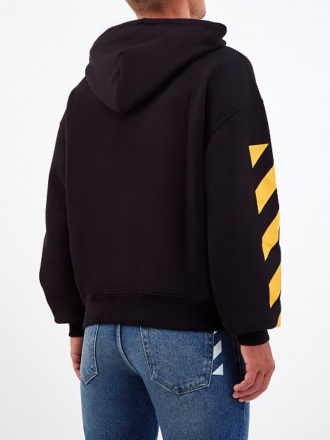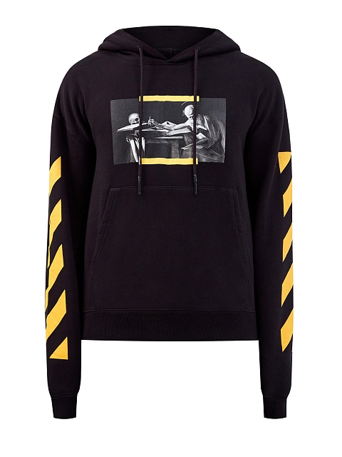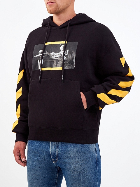 Эффектное худи Caravaggio от Off-White выполнено из плотного футера — внешняя гладкая поверхность в черном цвете дополнена мягкой внутренней отделкой. Изделие украшено макро-принтом на передней планке, рукава с ярким диагональным мотивом подчеркивают динамичный стиль бренда. Капюшон на кулиске и эластичные кромки обеспечивают надежную защиту от ветра.