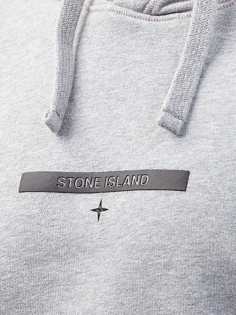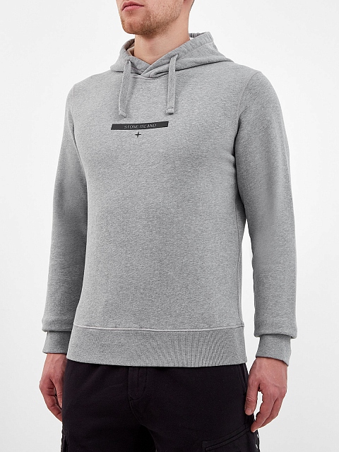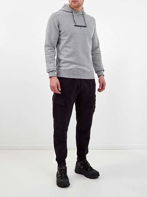 Мужское худи в стиле урбан от Stone Island выполнено из хлопкового футера в светло-сером оттенке, мягкий материал с фактурной внутренней поверхностью обеспечивает комфорт в движении. Фирменный штрих — контрастный логотип на передней планке. Детали: капюшон на регулируемой кулиске, эластичные манжеты и нижний край.