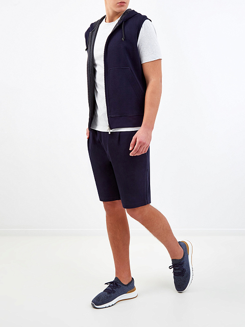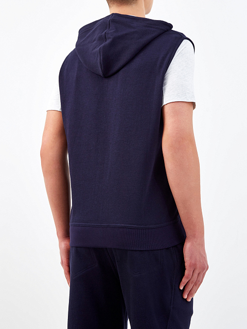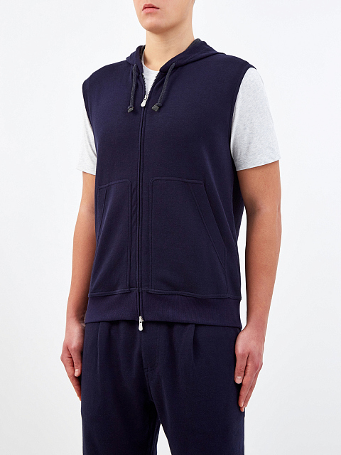 Лаконичный мужской жилет из коллекции для путешествий Travelwear от Brunello Cucinelli выполнен из интерлока — плотной хлопковой ткани с текстурой джерси с обеих сторон. Эластичный дышащий материал обеспечивает максимальный комфорт в движении. Посадка по фигуре достигается за счет эластичной нижней кромки. Детали: капюшон на кулиске, накладные карманы, застежка-молния. Сделано в Италии.