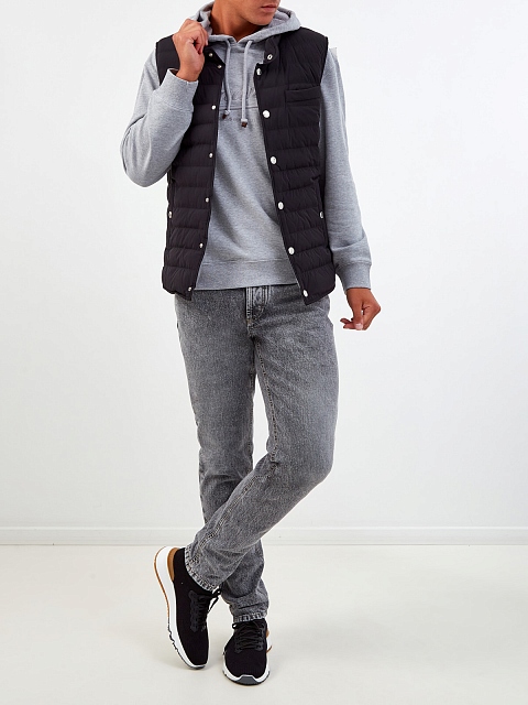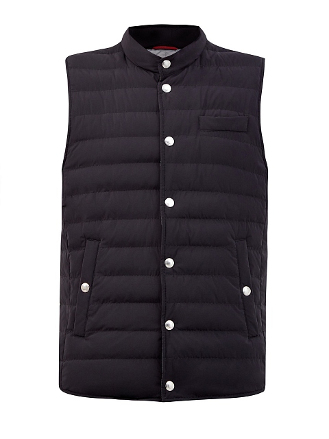 Лаконичный мужской жилет от Brunello Cucinelli выполнен из влагозащитного стеганого нейлона. Легкая утепляющая прослойка из пуха и пера надежно защищает от ветра, минималистичный дизайн идеально подходит для создания многослойных образов в период межсезонья. Детали: застежка на пуговицы на передней планке, внутренняя нашивка для инициалов владельца, прорезные карманы с бортами. Сделано в Италии.