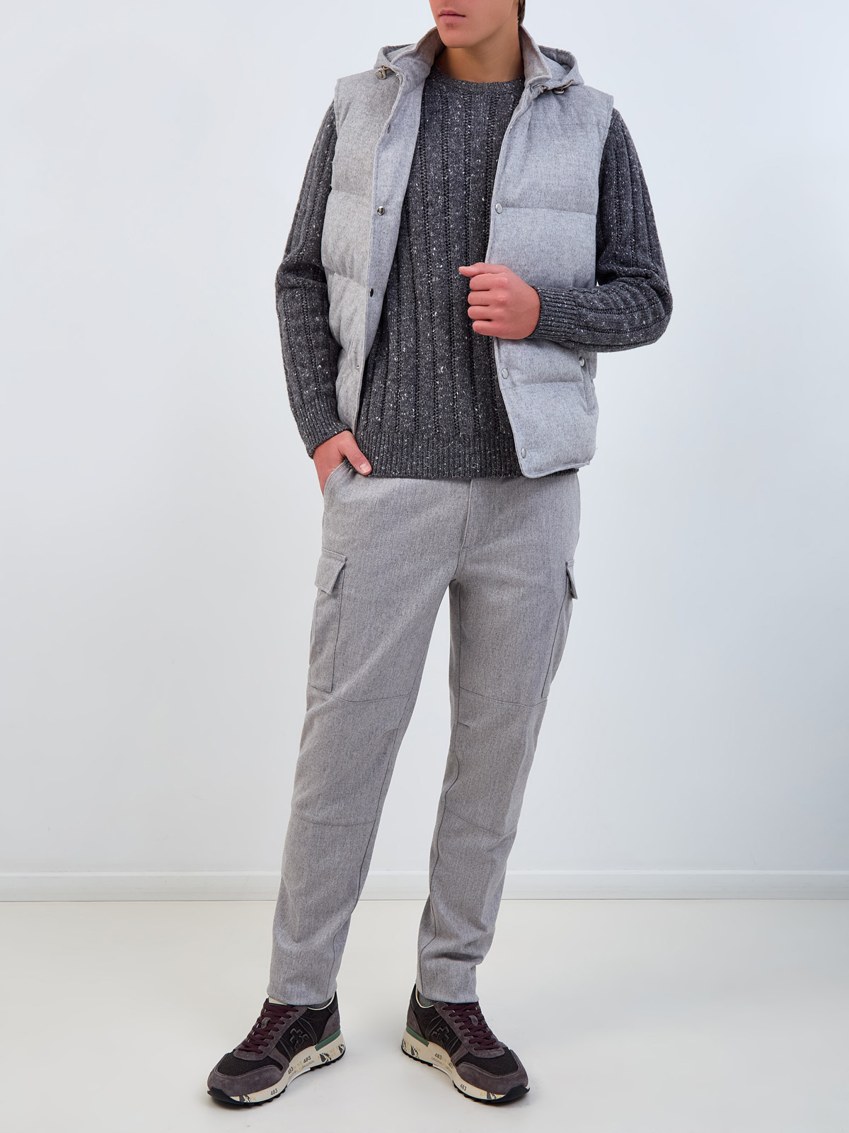 Стеганый мужской жилет от Eleventy выполнен из меланжевой фланели на основе ценных волокон кашемира и шелка. Утепляющая прослойка из пуха и пера и регулируемый съемный капюшон на молнии надежно защищают от ветра, минималистичный дизайн идеально подходит для создания многослойных образов. Детали: застежка на кнопки, прорезные карманы, потайной внутренний карман.