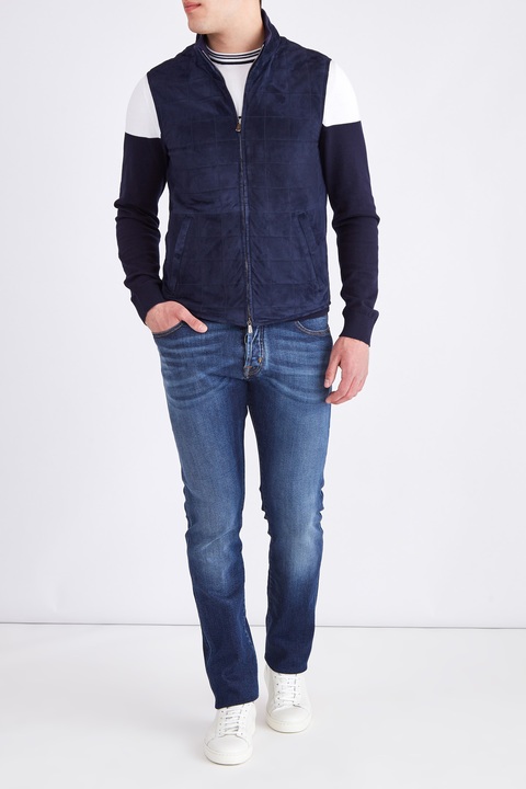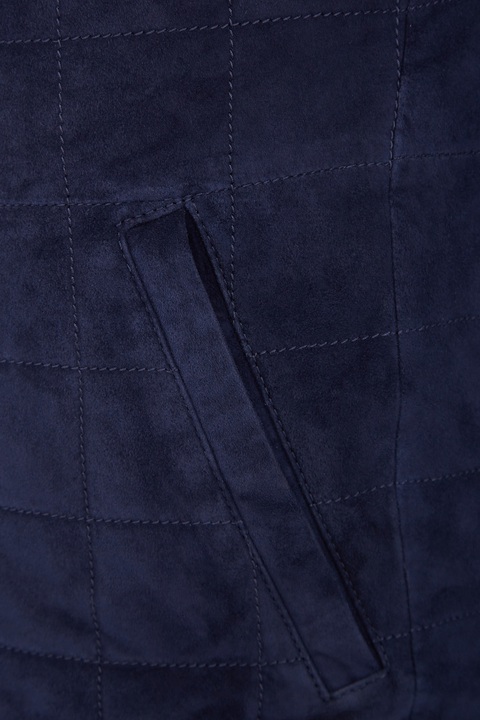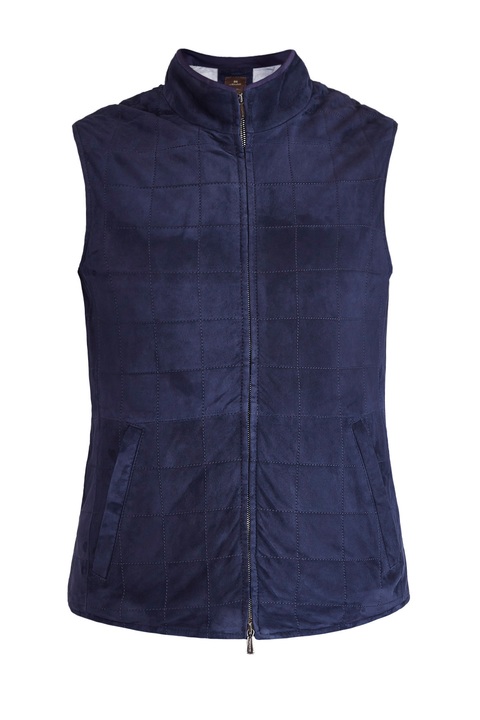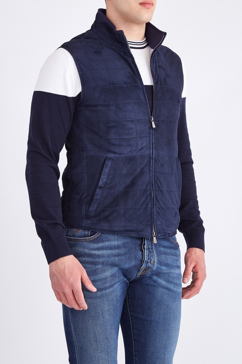 Стильный мужской жилет из весенне-летней коллекции Enrico Mandelli выполнен из замши с бархатистой поверхностью глубокого синего цвета, которая, несмотря на свою легкость, защищает от низких температур и обеспечивает циркуляцию воздуха. Модель декорирована трикотажной деталью в тон по линии высокого ворота. Эластичные вставки на талии обеспечивают посадку по фигуре. Функциональная застежка-молния завершает модель. Сделано в Италии.