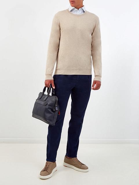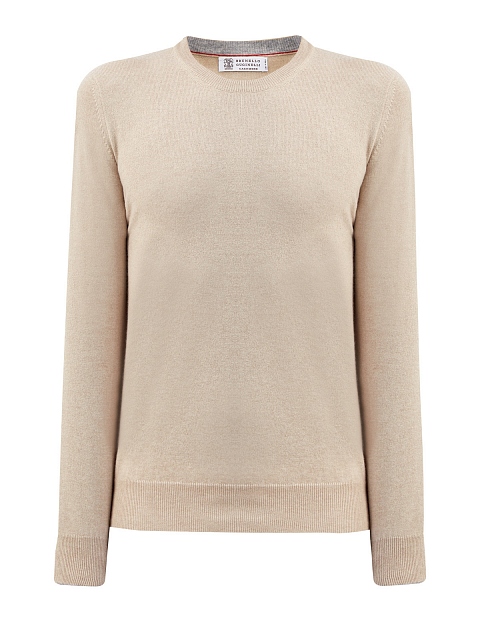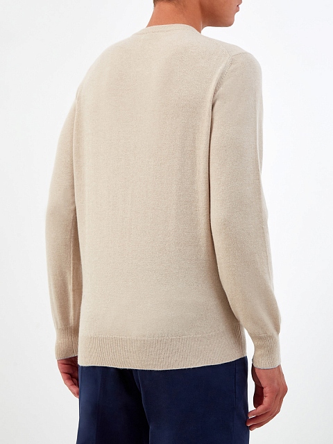 Лаконичный мужской джемпер от Brunello Cucinelli выполнен в универсальной бежевой гамме. Полностью натуральный материал на основе ценных волокон кашемира обладает свойством поддерживать температуру тела на оптимальном уровне. Эластичные элементы английской вязки обеспечивают посадку точно по фигуре, контрастная окантовка манжет вносит в образ неформальный штрих. Сделано в Италии.