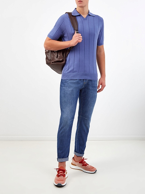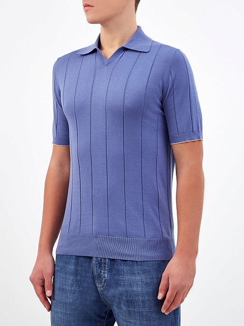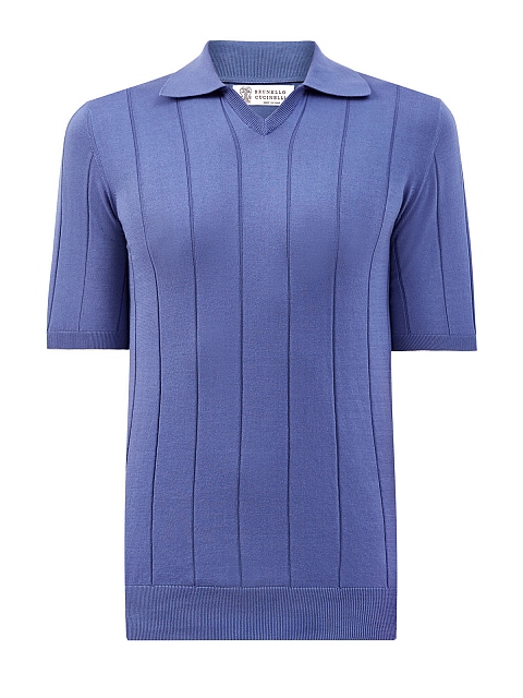 Джемпер-поло с короткими рукавами от Brunello Cucinelli выполнен из тонкой хлопковой пряжи. Полностью натуральный состав делает модель универсальным элементом базового летнего гардероба. Минималистичный дизайн подчеркивает ворот с V-образным вырезом, отделка в полоску вносит расслабленный штрих в повседневный образ. Сделано в Италии.