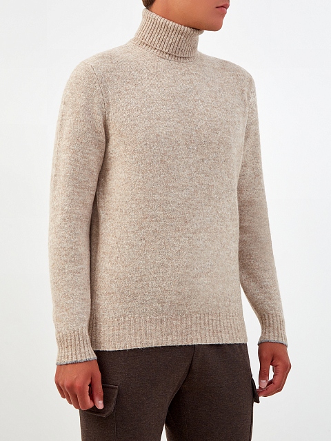 Лаконичный мужской свитер в бежевой гамме от Brunello Cucinelli. Модель из фактурной пряжи на основе ценных волокон альпаки, хлопка и шерсти идеально подходит для создания повседневных аутфитов. Высокий ворот в технике английской вязки дополнительно защищает от ветра, манжеты с тонкой контрастной окантовкой вносят в образ штрих индивидуальности. Сделано в Италии.