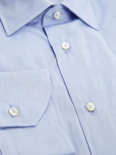 Базовая мужская рубашка от Canali выполнена из гладкой и легкой хлопковой ткани. Модель с длинными рукавами дополнена традиционным отложным воротом, застежкой на пуговицы и кокеткой на спинке для посадки по фигуре. Универсальный светло-синий оттенок станет идеальным дополнением повседневных и деловых образов. Сделано в Италии.