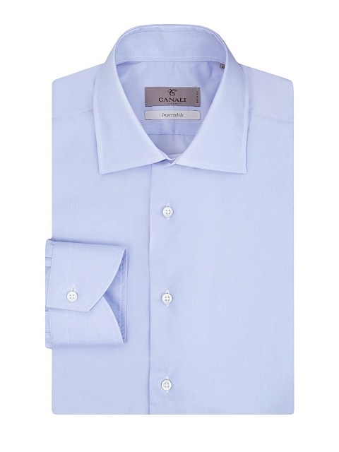 Мужская рубашка из гладкого хлопкового поплина от Canali представлена в универсальном голубом оттенке. Специальная обработка Impeccabile предотвращает образование складок и появление пятен. Классический крой делает модель идеальным решением для создания комфортных аутфитов в рамках делового дресс-кода. Детали: отложной ворот, пуговицы из перламутра, закругленный нижний край. Сделано в Италии.
