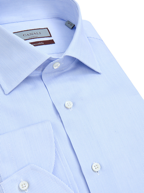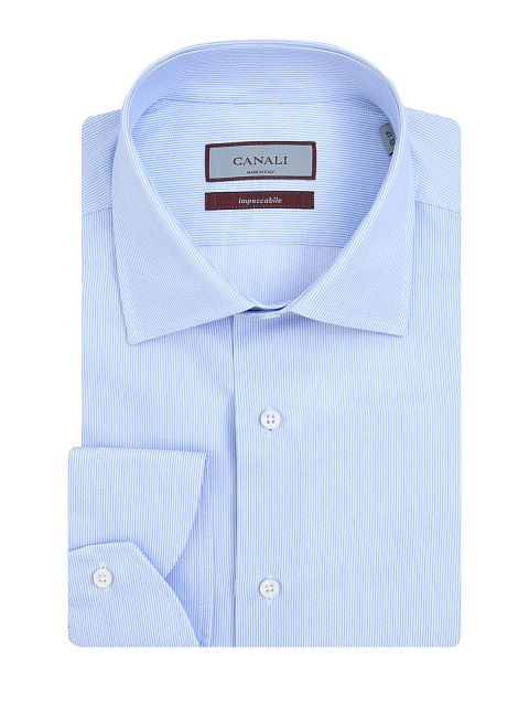 Рубашка из гладкого хлопкового поплина с принтом в тонкую пунктирную полоску от Canali выполнена в лаконичной бело-голубой гамме. Полностью натуральная ткань обеспечивает максимальный комфорт и сохраняет форму благодаря специальной обработке Impeccabile. Классический крой делает модель идеальным решением для создания комфортных аутфитов в рамках дресс-кода. Детали: отложной ворот, пуговицы из перламутра. Сделано в Италии.