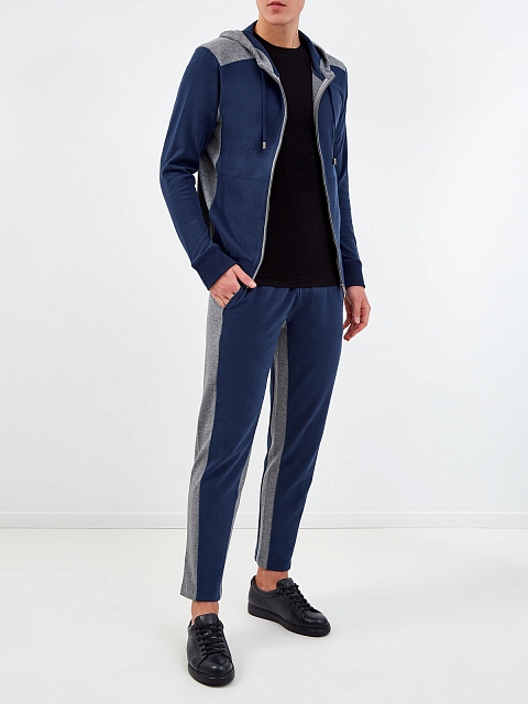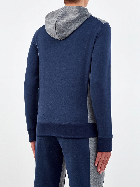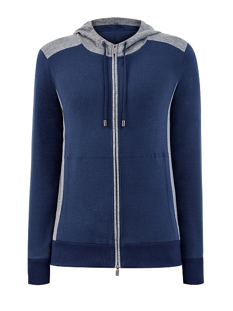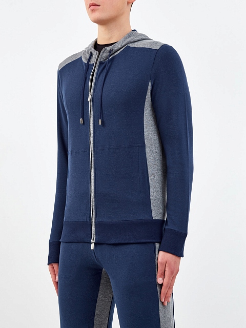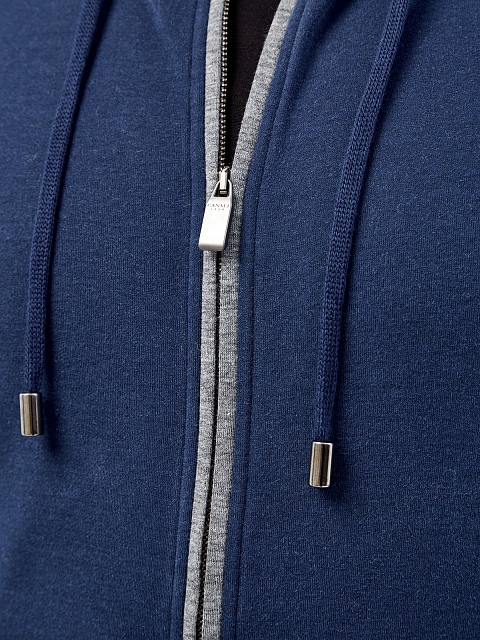 Толстовка в стиле colorblock от Canali. Модель выполнена из хлопка интерлок — ткани с гладкой фактурой джерси с обеих сторон. Натуральный состав обеспечивает максимальный комфорт и подходит для активного отдыха, путешествий и занятий спортом. Свободный крой не стесняет движений. Сочетание двух оттенков синего придает образу динамику, а лампасы по бокам вносят контрастный акцент. Детали: капюшон, застежка-молния, два кармана. Сделано в Италии.