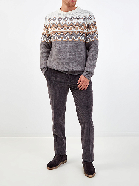 Теплый мужской пуловер с геометрическим узором от Canali. Модель из фактурной пряжи на основе ценных волокон шерсти и альпаки идеально подходит для создания повседневных аутфитов. Сочетание белых, бежевых и серых тонов подчеркивает расслабленное настроение изделия. Детали: круглый вырез горловины, отделка кромок в технике эластичной английской резинки. Сделано в Италии.