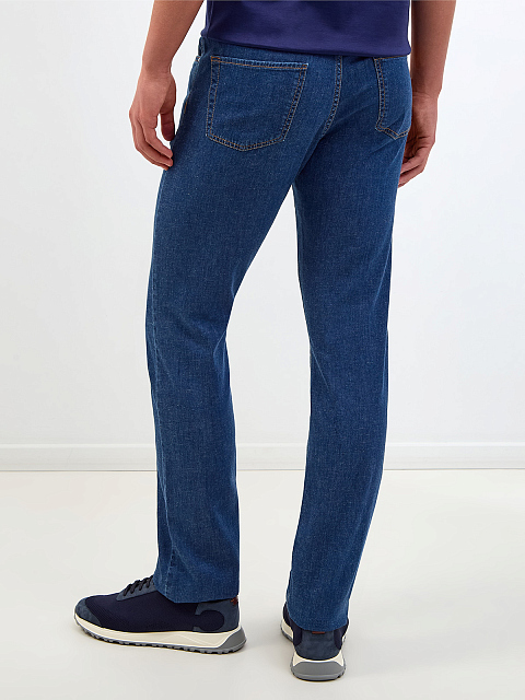 Мужские джинсы от Canali выполнены из окрашенного вручную хлопкового денима, волокна лиоцелла и льна в составе обеспечивают максимальный комфорт в движении. Изделие в классическом синем оттенке дополнено застежкой на молнию и брендированную пуговицу с и нашивкой из кожи с тиснением на поясе. Детали: прострочка швов нитью цвета охры, пять карманов. Сделано в Италии.
