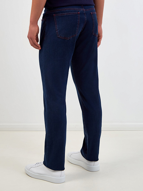 Окрашенные вручную джинсы с контрастной прострочкой и нашивкой