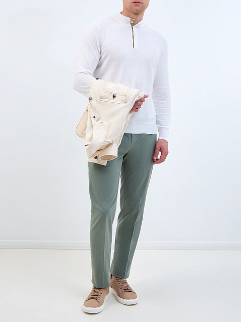Стильные брюки прямого кроя от Canali выполнены из эластичного хлопкового твила. Изделие с традиционной посадкой на талии и притачным ремнем со шлевками для ремня. По бокам диагональные прорезные карманы, на спинке карманы с бортами на пуговицах. Асимметричная застежка на молнию и пуговицы завершает лаконичный дизайн. Сделано в Италии.