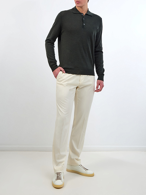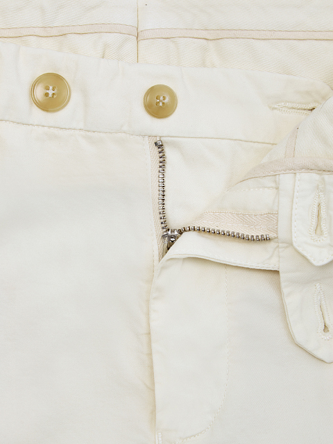 Минималистичные мужские брюки в стиле casual от Canali выполнены из хлопкового твила с добавлением волокон шелка и эластана. Модель в нейтральном бежевом оттенке с диагональными прорезными карманами дополнена карманами с бортами на спинке. Детали: прямой крой, притачной пояс с петлями для ремня и асимметричной застежкой на молнию и пуговицы. Сделано в Италии.