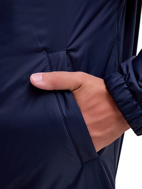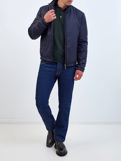 Лаконичная мужская куртка-бомбер от Canali выполнена из водонепроницаемой ткани с деликатным матовым блеском в оттенке индиго. Внутренний слой из легкого гипоаллергенного наполнителя утепляет изделие, воротник-стойка и эластичные манжеты и нижний край делают дизайн максимально универсальным. Детали: прорезные карманы, застежка на молнию с пуллером из кожи. Сделано в Италии.